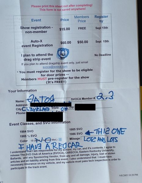 For your inspection -- Gator's 05 Reunion registration. His address and phone have been blanked out to protect the innocent?