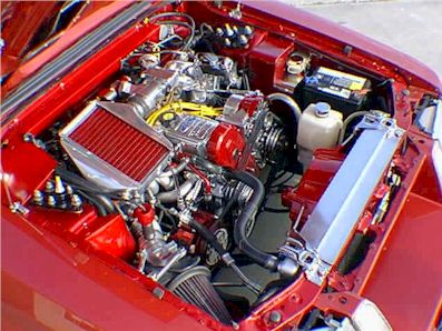 On the maintenance end, the valve seals were showing their age, and while they were being replaced, an Engle 55C was pressed into bump duty service. The motor bay was in need of fresh paint, as was the hood where the TC-IC flange was making occasional contact. I pulled the IC, and machined down the flange to a 1/4" width. This exposed the end tanks, and the smooth finish didn't match the previous blue wrinkle finish. That wrinkle finish just had to go. Sandblasting didn't seem to affect the epoxy much, so I removed it with a wire wheel, followed up by 100 grit sandpaper. Once again painted in Ford Blue, it went back to its mounting position and.........didn't look right. Sanded it down, and repainted it in the matching red metallic motor bay color. Not bad, but now the rest of the Blue Oval Blue motor scheme didn't look right. I'd try another tack. Since I had the machinery and materials, I'd polish the IC, just to see how it looked.. Nice Change! , but would look better if the 65mm Throttle Body was polished too. And the Upper/Lower Intake Manifold. But that really clashed with the Blue Valve Cover, so it got polished, and I might as well do the Alternator, and all the mounts, and .... well you get the picture. 4 months later... here's the result. Oh, the pulley's, mounts, some hard lines I bent up to replace the vacuum hoses, and anything else that was steel and un-boltable went to Highland Plating for a dip in the chrome tank.